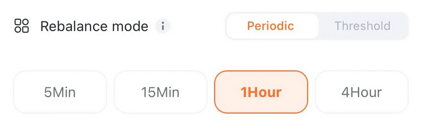 Periodic mode rebalances at fixed time intervals, like every 5 minutes, 1 hour, or 4 hours, regardless of price changes.