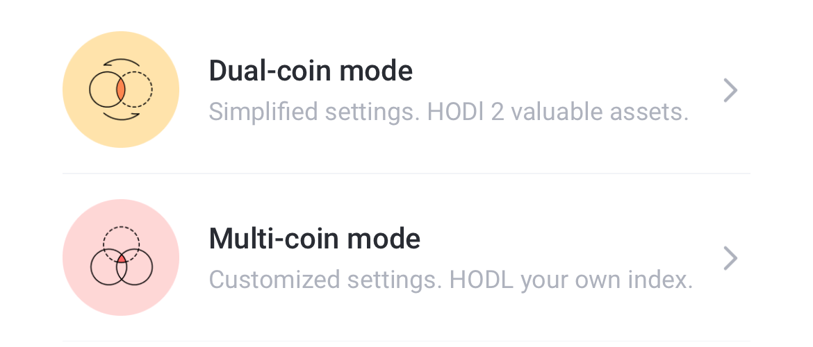 The dual coin mode will purchase equal amounts of Bitcoin and Ethereum based on the current market price. The bot will check in every five minutes, adjusting it’s position to reflect changes in the two coins’ exchange rates and maintaining a 1:1 position ratio at all times. If you invest $1,000, then it will put $500 into BTC and $500 into ETH.