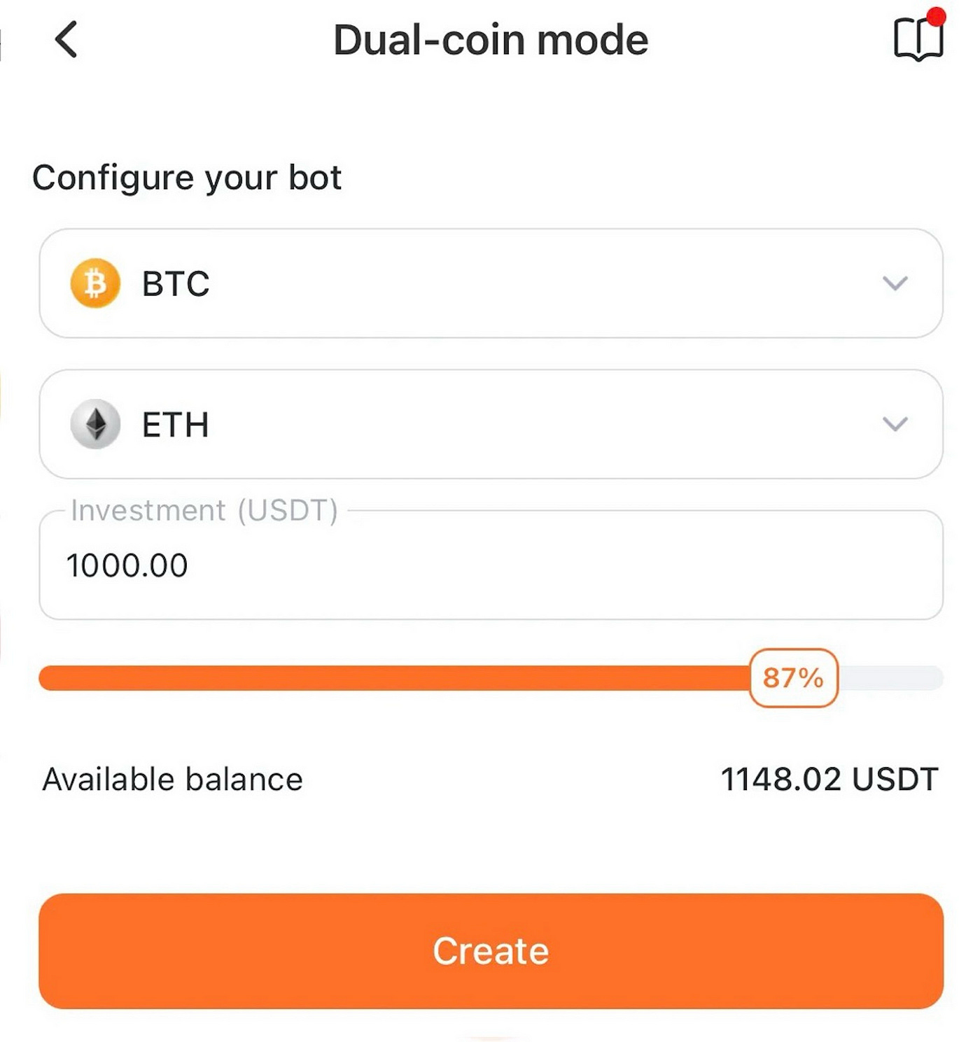 If you build a rebalancing and select dual-coin mode with BTC and ETH, the bot will distribute your holdings at a 1:1 ratio.