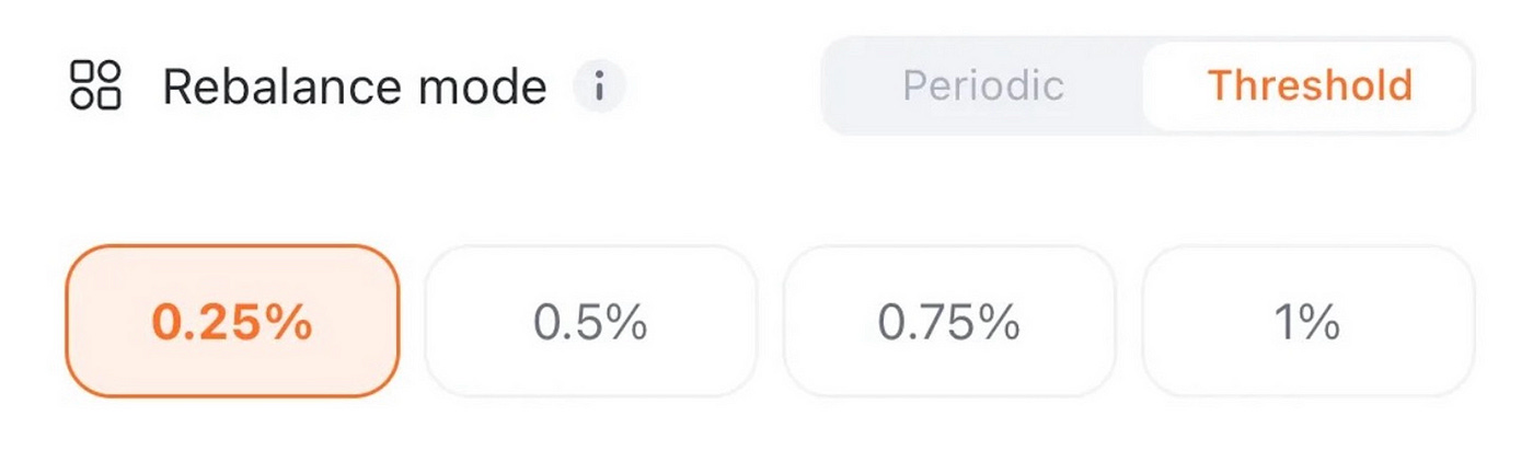 Threshold mode rebalances only when a coin’s proportion deviates by a set percentage, like 0.25% or 1%, from your target ratio.