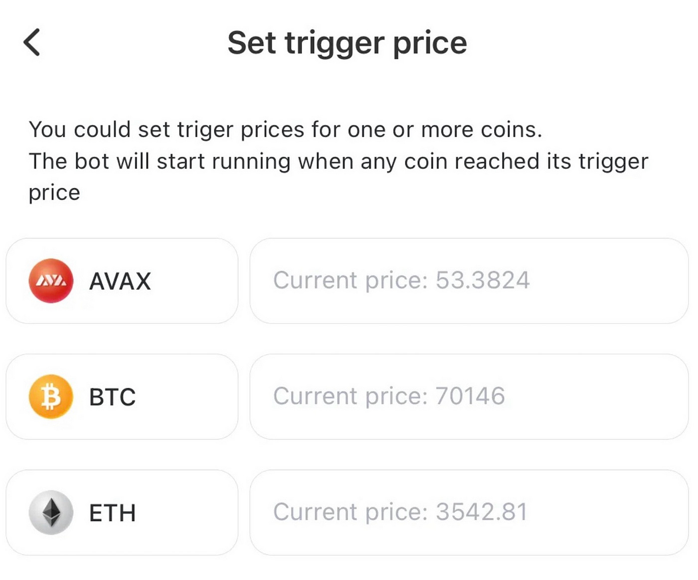 This lets you time your entry, like waiting for a dip or a breakout, ensuring the bot doesn’t start in a market you’re not ready for. Say you set a Trigger Price of $3,000 for ETH with a $1,800–$2,200 range for rebalancing — it only begins when ETH hits $3,000, then maintains your ratios within that range.