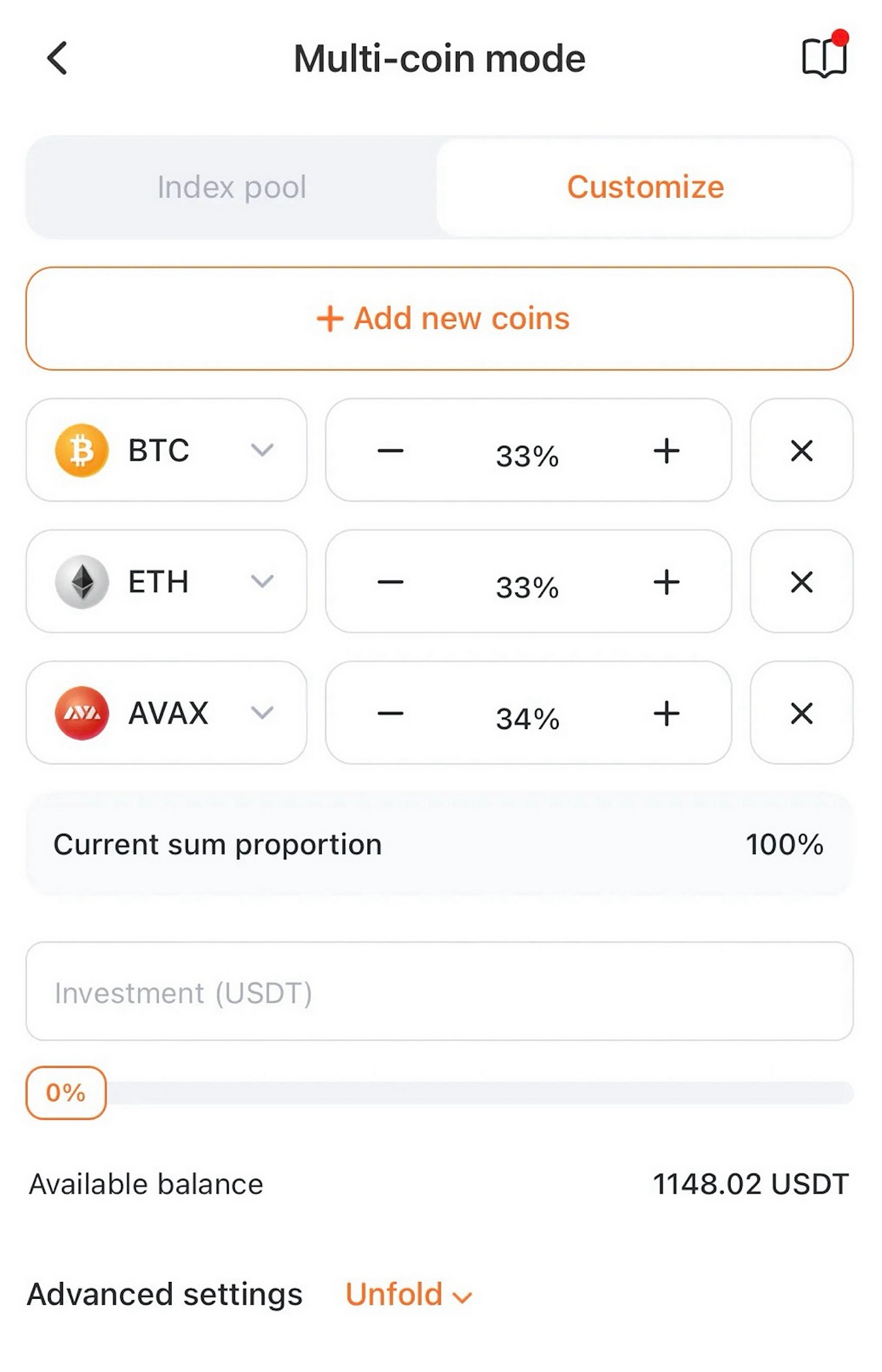 Up to ten coins can be allocated in the “Multi-coin mode.” Their allocation will be equal and proportional. So 3 coins will be 33% each, and 4 could be 25%, and so on.